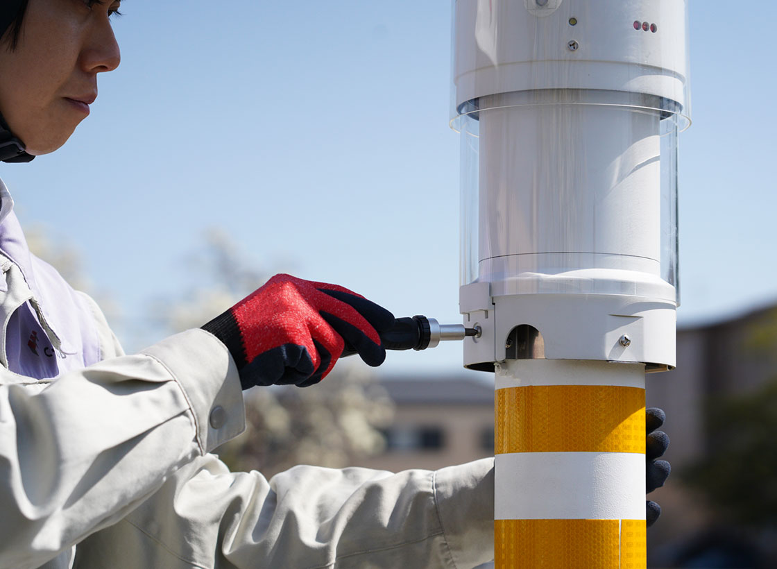 機器の内径はガードレール支柱にぴったりおさまる寸法に設定されています。設置場所での取付の際にも、支柱にかぶせて取付金具と機器をネジ留めするだけで完了。ネジも一般的な形状ではなく特殊形状を使用し、持ち去り等を防止します。